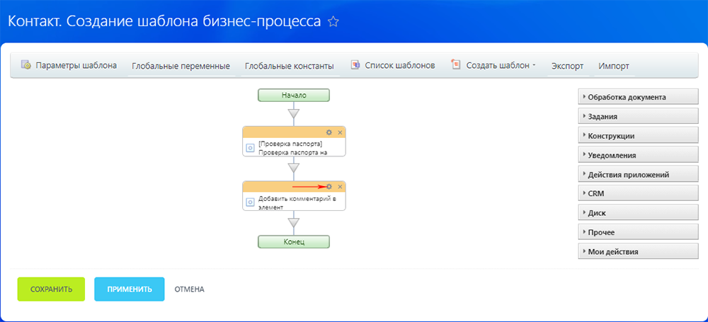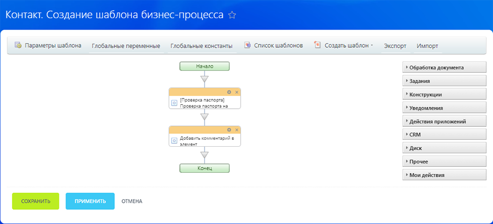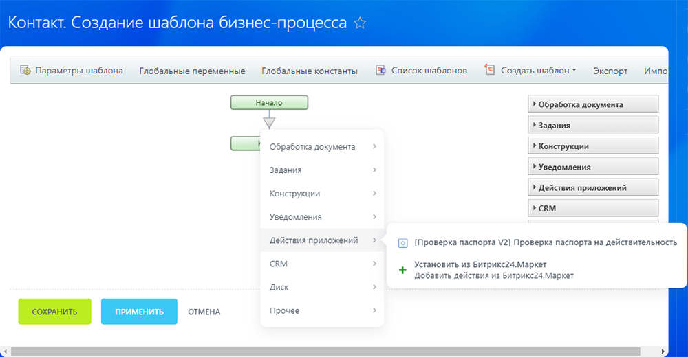 По умолчанию при установке приложения добавляется активити в конструктор бизнес-процессов.