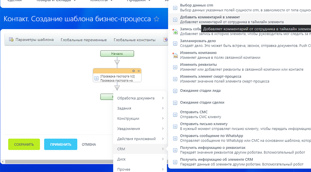 В карточки CRM добавлен новый пункт меню "Проверка паспорта"