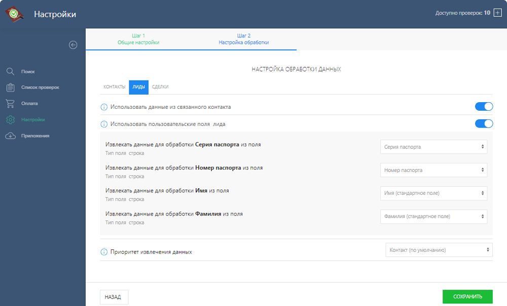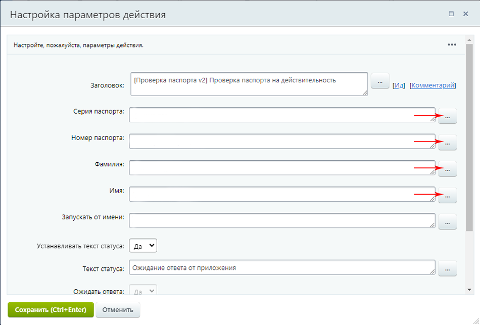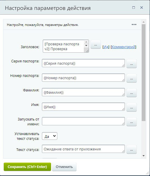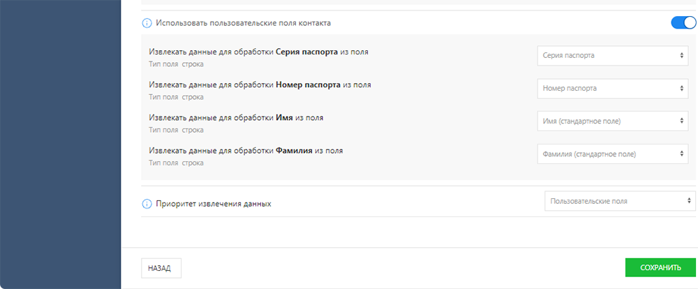 Настройка полей: "Серия паспорта", "Номер паспорта", "Имя", "Фамилия" из которых будут ивзлекаться данные для обработки