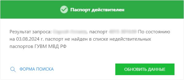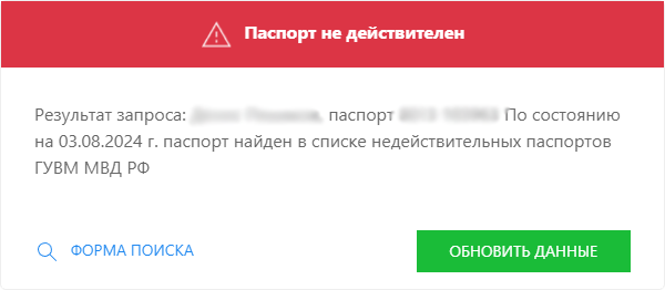 - NOT_FOUND - паспорт не прошел проверку в МВД, возможно, он является поддельным или был выдан недавно, и на данный момент его данных еще нет в базе данных МВД.